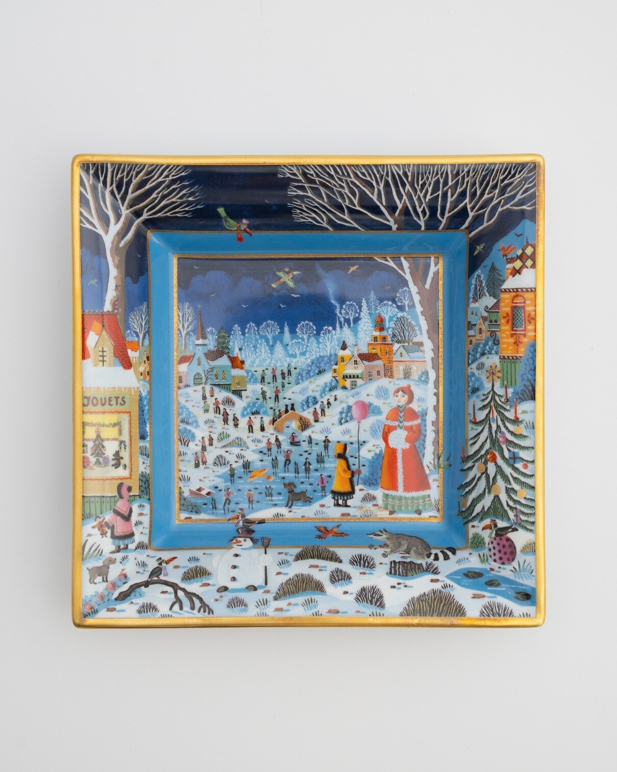 Эксклюзивное квадратное блюдце Haviland с зимней деревней. Лиможский фарфор, золотая окантовка 24 карата.