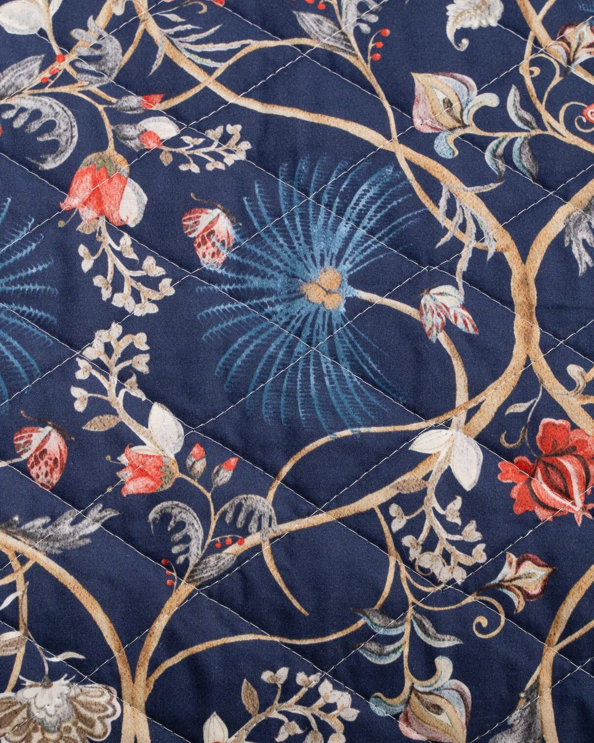 Погрузите спальню в атмосферу средиземноморского сада с покрывалом Mirabello из коллекции Oasis. Глубокий синий фон подчеркивает изысканную вышивку золотых стеблей, бирюзовых листьев и коралловых цветов. Итальянское качество, эксклюзивная стежка и богатая палитра создают визуальную глубину и неповторимый уют.
