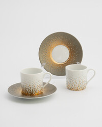 Коллекция Souffle d’Or — это дыхание золота и серебра на безупречном лиможском фарфоре. Каждый предмет расписан вручную, создавая уникальное сияние и объем. Изысканные узоры из драгоценных металлов переливаются при свете, превращая сервировку стола в произведение искусства. Это наследие Haviland для изысканных приемов, говорящее о вашем безупречном вкусе. Набор на 4 персоны из 8 предметов.